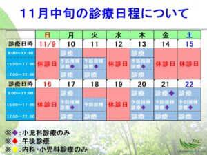令和7年11月中旬の診療日程ですが、当方の都合により一部変更させて頂きます。